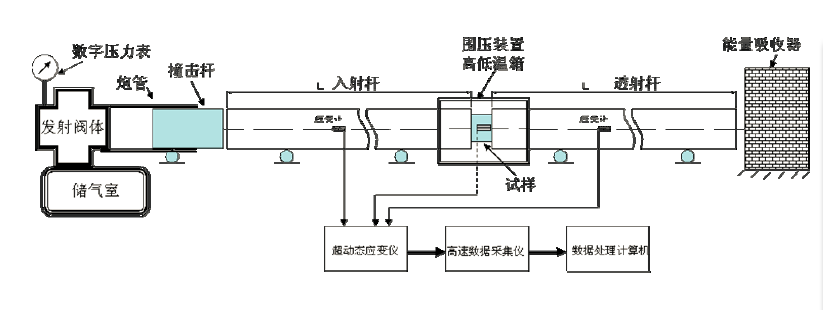 本套Hopkinson 壓桿系統(tǒng)主要包含:發(fā)射及控制系統(tǒng)、桿系及主體平臺、數(shù)據(jù)采集系統(tǒng)、測速系統(tǒng)及分析軟件等,其示意圖如下所示。