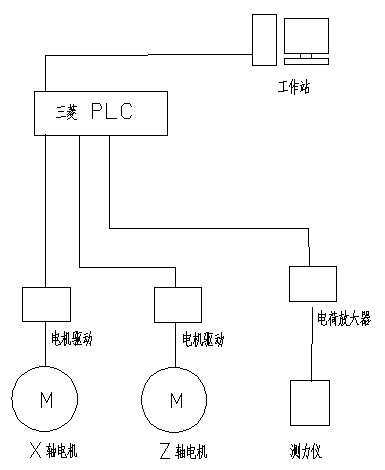軟件系統(tǒng)由工作站、微型可編程控制器、電機(jī)驅(qū)動器、X軸電機(jī)、Z軸電機(jī)、實驗室多通道電荷放大器、測力儀和專用軟件組成。
